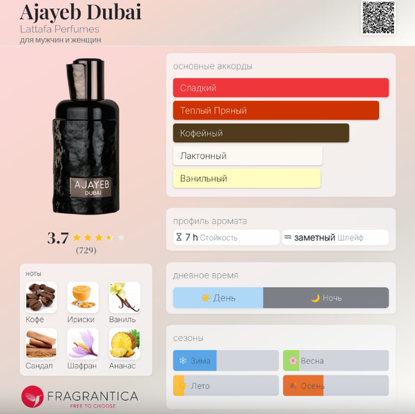 Lattafa Perfumes Ajayeb Dubai – это аромат, созданный брендом Lattafa Perfumes в 2023 году. Он представляет собой уникальное сочетание восточных и гурманских нот, которые придают ему интригующий и роскошный характер.Аромат Lattafa Perfumes Ajayeb Dubai открывается яркими верхними нотами шафрана и сладкого ананаса. Это сочетание придает парфюмерной композиции свежесть и легкость. В сердце этого аромата распускается кофейная арабика, которая добавляет теплый пряный акцент, дополняемый листьями фиалки. Базовые ноты сандалового дерева, ириски и ванили придают завершенность этому уникальному парфюму.