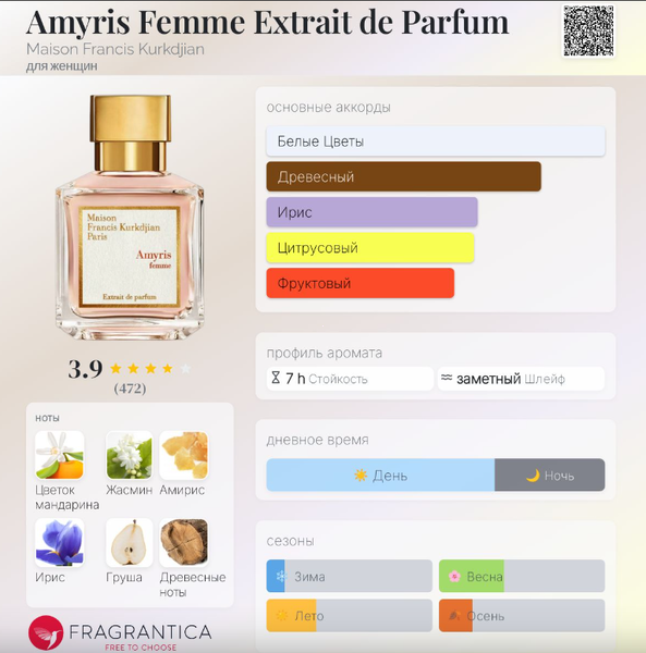 | Верхние ноты | Цветок мандарина, Египетский жасмин |