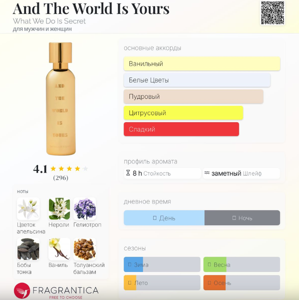| Базовые ноты | Сандал, Толуанский бальзам, Бобы тонка, Ваниль |