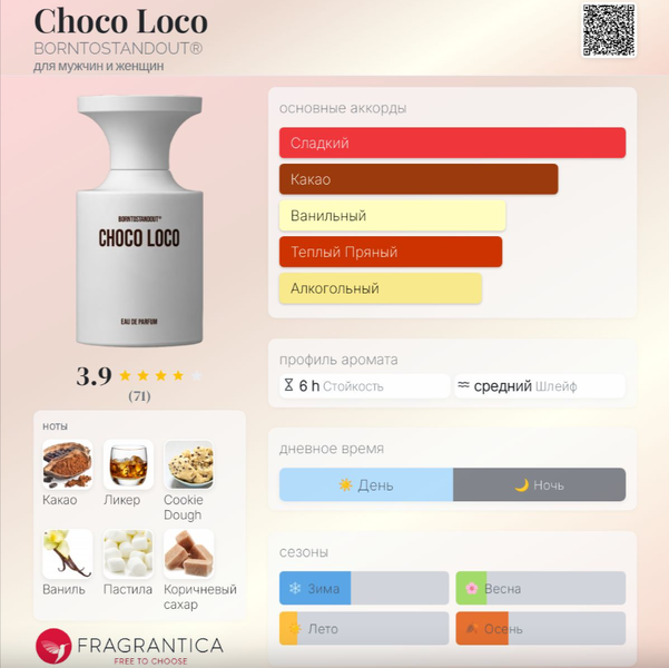 | Верхние ноты | Какао, Ликер, Сливочное масло |