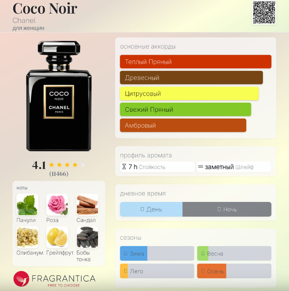 | Базовые ноты | Пачули, Сандал, Олибанум, Бобы тонка, Ваниль, Белый мускус, Гвоздика, Бензоин |