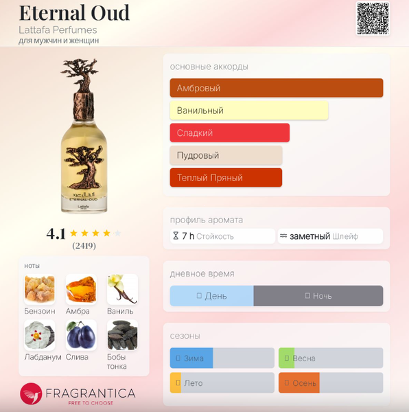 | Базовые ноты | Бензоин, Амбра, Ваниль, Лабданум, Бобы тонка, Уд |