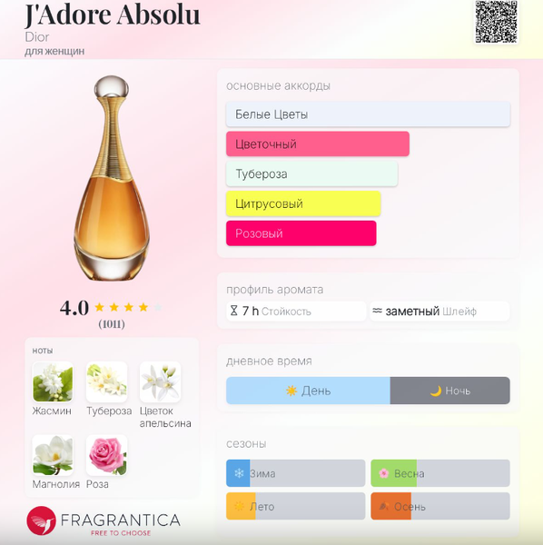 | Средние ноты | Жасмин, Индийская тубероза, Майская роза |