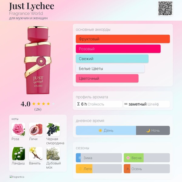 | Верхние ноты | Личи, Черная смородина, Карамель, Ананас |