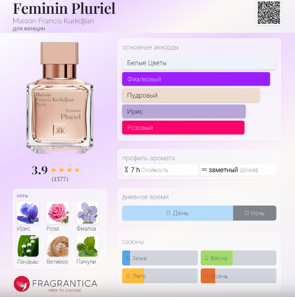 | Верхние ноты | Ирис, Роза, Фиалка, Ландыш |