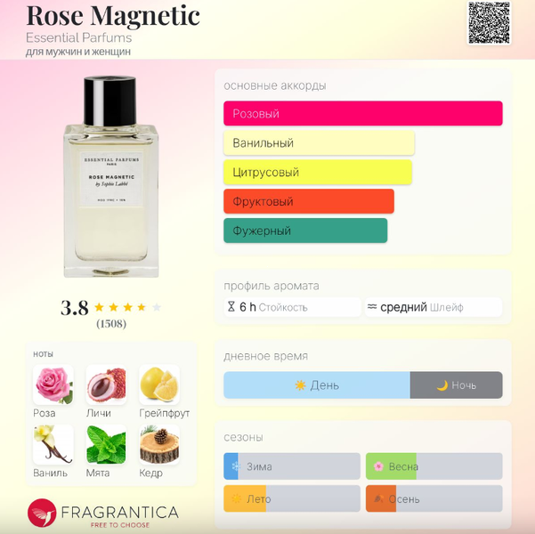 | Верхние ноты | Турецкая роза, Роза, Личи, Грейпфрут |