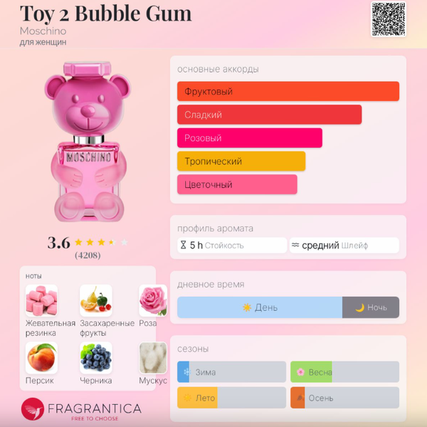 | Средние ноты | Жевательная резинка, Болгарская роза, Персик, Черника, Цветок персика, Корица, Имбирь |